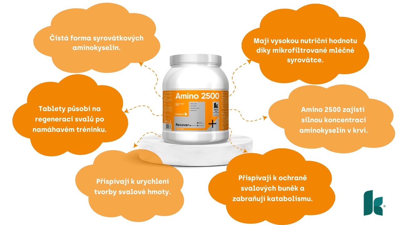Aminokyseliny Amino 2500 mají vysokou nutriční hodnotu díky mikrofiltrované mléčné syrovátce nejvyšší kvality. Jsou biologicky vysoce aktivní a dokáží až několikanásobně urychlit tvorbu svalové hmoty, čímž dosáhnete okamžitý anabolický efekt (zvyšování síly a růst svalové hmoty). Syrovátkové aminokyseliny obsažené v Amino 2500 zajistí silnou koncentraci aminokyselin v krvi, díky čemuž může lidský organismus při tvorbě svalů počítat s dostatečným příjmem stavebního materiálu. Zároveň chrání svalové buňky a zabraňují katabolismu (rozkladu) svalových bílkovin po tréninku.