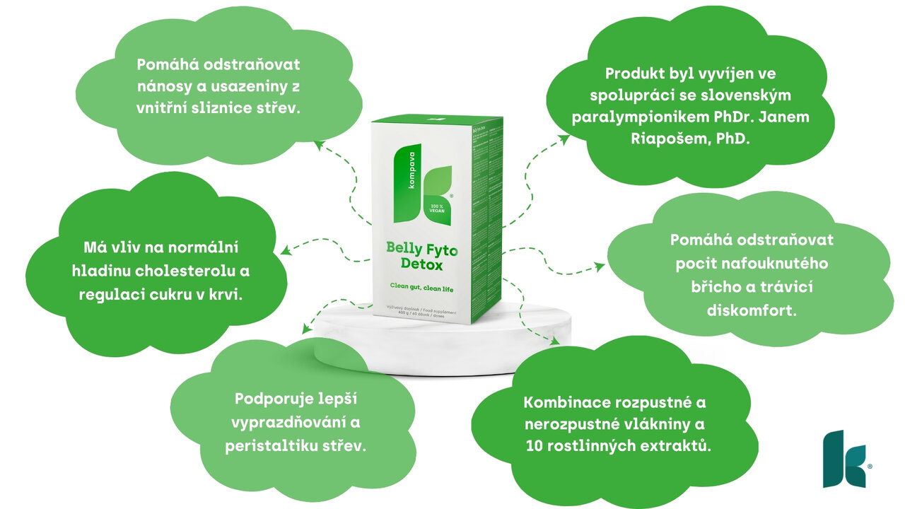 Belly Fyto Detox je čistě přírodní kombinace rozpustné a nerozpustné vlákniny, která na sebe váže škodlivé látky v procesu trávení, čímž eliminuje jejich kontakt se sliznicí a absorbování do krve a tkání. Přispívá k odstranění nánosů a usazenin z vnitřní sliznice střev, které vznikly v důsledku nezdravého životního stylu, čímž dochází k pročištění střev. Rozpustná vláknina tvoří s vodou gel, který zpomaluje trávicí procesy, čímž zajišťuje delší vyprazdňování žaludku a tím i lepší absorpci živin. Pozitivně ovlivňuje normální hladinu cholesterolu a regulaci cukru v krvi.