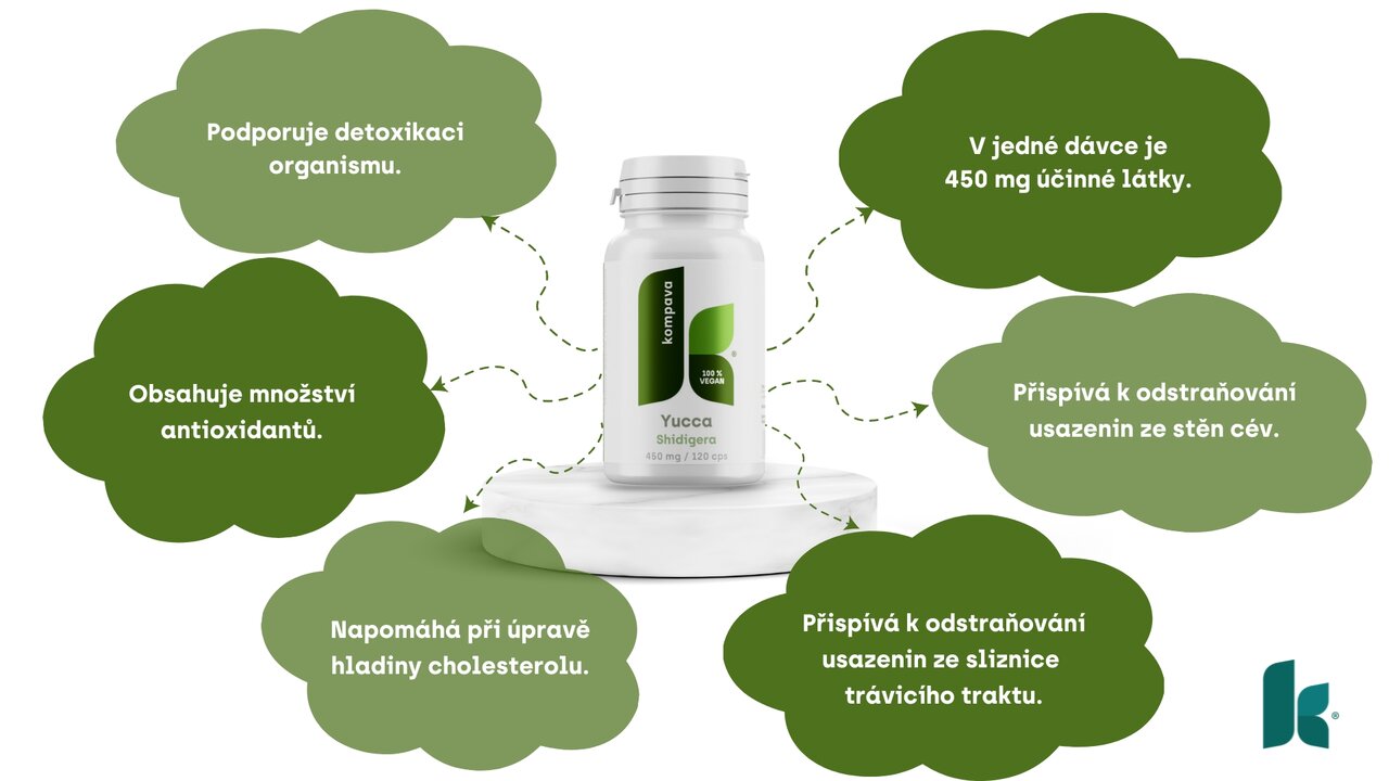 Hlavními účinnými látkami Yucca Schidigera jsou ve vodě rozpustné stearánové a ve vodě nerozpustné terpenové saponiny. Jejich působení je fyzikální. V lidském organismu se mění na sapogenin, který působí jako mýdlo. Sapogenin způsobuje snížení povrchového napětí buněk tkání na všech plochách v organismu a postupné, pomalé vylučování emulgovaných částic (zkapalněných usazenin) z organismu. Yucca tímto způsobem napomáhá detoxikaci organismu a k odstraňování usazenin ze střeva i stěn cév od nánosu. Kromě saponinů obsahuje Yucca Shidigera také množství antioxidantů, které mohou napomáhat v boji proti volným radikálům a podporovat vitalitu. Napomáhá při úpravě hladiny cholesterolu v srdečně-cévním systému, přispívá k odstraňování usazenin ze sliznice trávicího traktu a úpravě hladiny krevního tlaku.