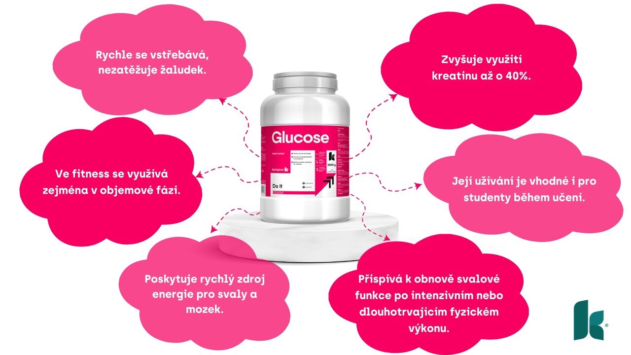 Glukóza přispívá k obnově normální svalové funkce po vysoce intenzivním nebo dlouhotrvajícím fyzickém výkonu, jehož výsledkem je svalová únava a vyčerpání ze zásob glykogenu v kosterním svalstvu. Glukózu doporučujeme přidávat i do kreatinu, díky čemuž se zvyšuje využití kreatinu až o 40 %, přičemž vzniká reakce, kdy se kreatin automaticky dostane do cílové buňky rychleji.