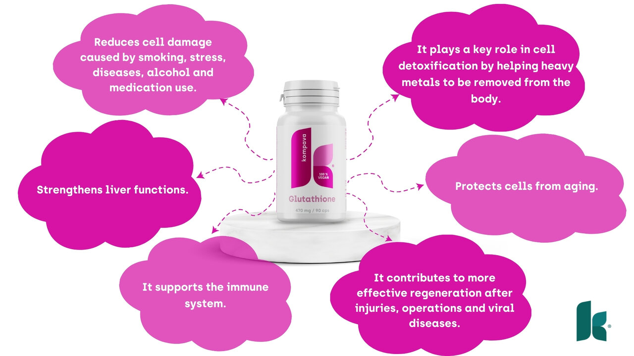 Glutation je považován za jeden z nejúčinnějších antioxidantů produkovaných organismem. Pomáhá neutralizovat volné radikály a reaktivní kyslíkové formy, které jsou škodlivé molekuly, způsobující poškození buněk a vedoucí k různým zdravotním problémům. - Buněčná detoxikace