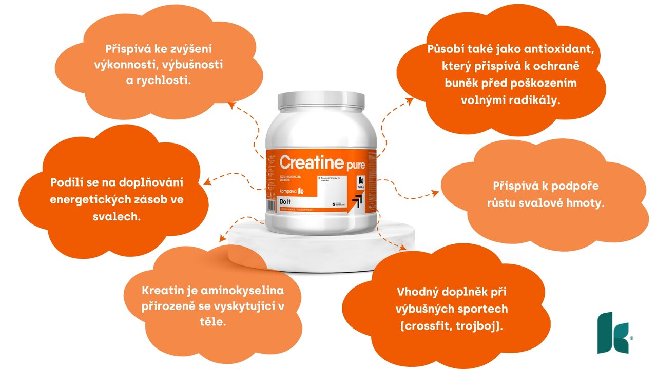 Kreatin je aminokyselina přirozeně se vyskytující v těle, která se využívá k energetickému zásobování svalů, mozku, srdce, ale i samotných buněk. Přispívá k podpoře růstu svalové hmoty, zvyšování síly, dynamiky a fyzické výkonnosti. Zvyšuje fyzickou výkonnost při opakovaných vysokointenzivních cvičeních s krátkými intervaly odpočinku. Denní příjem kreatinu (3 g) může zvýšit účinek odporového tréninku a svalovou sílu u lidí starších 55 let. Kreatin zároveň působí také jako antioxidant, který přispívá k ochraně buněk před poškozením volnými radikály.
