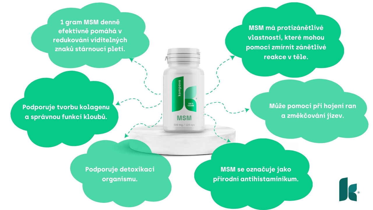 MSM má příznivý vliv na pojivové a chrupavčité tkáně, které obsahují proteiny s flexibilní sírovou vazbou. Podporuje tvorbu důležitých aminokyselin, včetně glutathionu, cysteinu a methioninu, které jsou důležité pro tvorbu kolagenu a správnou funkci kloubů. Může pomoci při hojení ran, uvolňování křečí, změkčování jizev či zmírňování bolestí a zánětů kloubů. MSM může pomoci zmírnit bolest a zánět spojený s artritidou. - zmírňuje alergické projevy