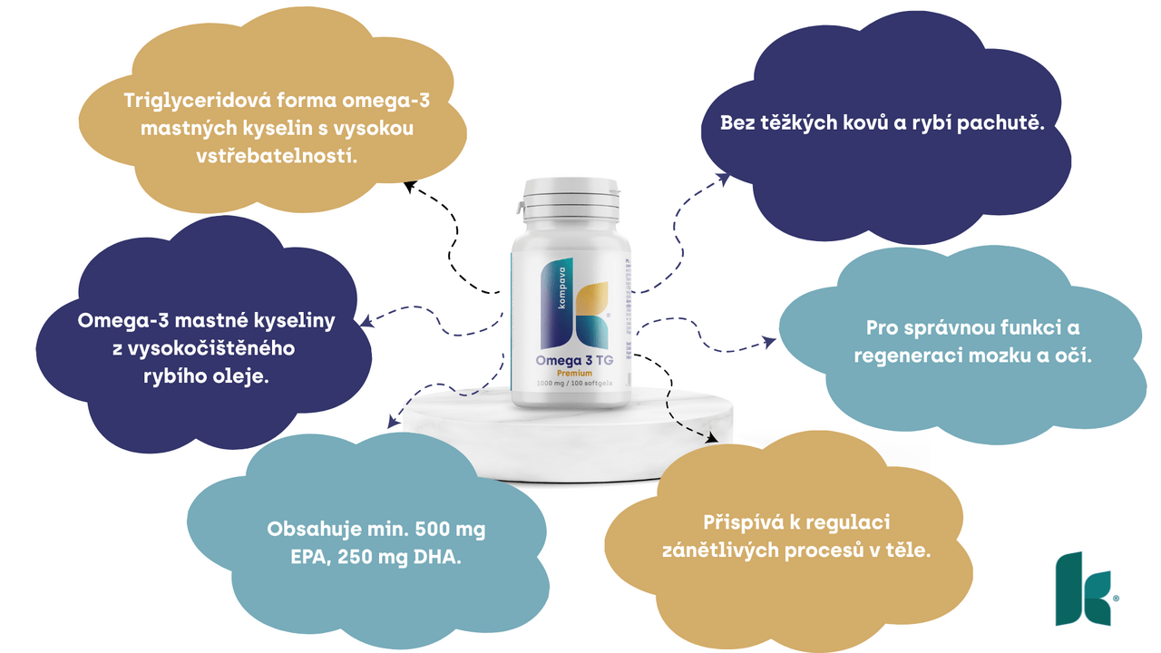 Omega 3 TG Premium obsahuje omega-3 mastné kyseliny EPA a DHA, které jsou přirozenou součástí stravy z mořských zdrojů. EPA je složka, která se podílí na různých procesech v těle, včetně reakcí souvisejících se zánětlivými mechanismy. DHA je důležitou součástí struktury mozku, očí a buněčných membrán. Jejich pravidelný a dostatečný příjem je spojen s lepší regenerací, stabilitou cév, normální reakcí imunitního systému a podporou psychické odolnosti. Proto je příjem kvalitní formy omega-3 ve formě koncentrátu TG důležitý jako aktivní nutriční podpora během zvýšeného stresu nebo v období růstu a stárnutí. Forma omega-3 TG představuje optimální způsob, jak zajistit účinný a dobře tolerovaný přísun těchto nezbytných látek v denním režimu.