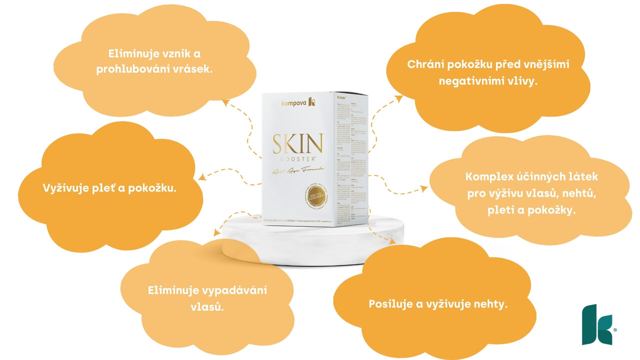 Revoluční luxusní přípravek v péči o pleť, vlasy a nehty. Skinbooster® svým složením zabraňuje prohlubování vrásek, vypíná je a zajišťuje pleti hydrataci. Chrání pokožku před vnějšími negativními vlivy, které pleť zatěžují a zanechávají na ní viditelné známky poškození a stárnutí - vrásky. Vyživuje vlasy a nehty přírodními a tělu vlastními složkami, které zajišťují, aby byly vlasy silnější, lesklejší a pevnější. U nehtů snižuje tendenci štěpení a dodává jim pevnost a zdravý vzhled.